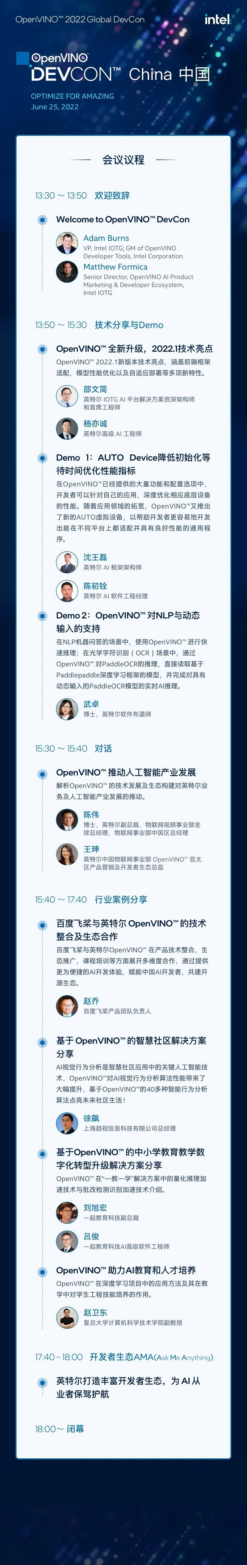 2022 OpenVINO? DevCon·中國(guó)站將在萬眾矚目下于2022年6月25日以線上峰會(huì)的形式“登陸”上海。這場(chǎng)全球性的 OpenVINO? 開發(fā)者盛會(huì),將由 OpenVINO? 核心技術(shù)專家分享最新的產(chǎn)品信息和技術(shù)演示,同時(shí)邀請(qǐng)行業(yè)與教育領(lǐng)域具有影響力的多家企業(yè)共同參與,邀請(qǐng)多位大咖進(jìn)行行業(yè)洞見、技術(shù)分享、案例展示等多維度的分享與交流,幫助開發(fā)者在提升技術(shù)的同時(shí),拓寬職業(yè)視野,了解行業(yè)趨勢(shì)。