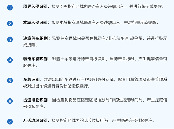 作為智慧社區(qū)構(gòu)建的基礎(chǔ)技術(shù),視頻分析扮演著重要角色。智能視頻分析系統(tǒng)能夠通過攝像頭等設(shè)備,采集社區(qū)中的人、車、公共設(shè)施等管理對象的視覺數(shù)據(jù),并通過服務(wù) 器、網(wǎng)關(guān)等設(shè)備進(jìn)行自動化、智能化分析,從而生成智慧化的數(shù)據(jù)洞察。在長期的實(shí)踐中,智能視頻分析系統(tǒng)被證明可以有效滿足用戶在周界入侵識別、違章停車識別、違停識別、垃圾管理、公共設(shè)施管理等方面的需求,助力營造卓越的社區(qū)/園區(qū)環(huán)境。