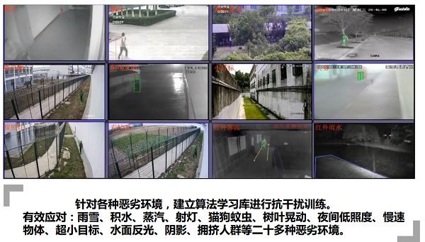 趨視科技針對(duì)各種惡劣環(huán)境,建立算法學(xué)習(xí)庫(kù)進(jìn)行抗干擾訓(xùn)練,能有效滿(mǎn)足雨雪、積水、蒸汽、射燈、貓狗蚊蟲(chóng)、樹(shù)葉晃動(dòng)、夜間低照度、慢速物體、超小目標(biāo)、水面反光、陰影、擁擠人群等二十多種惡劣環(huán)境的應(yīng)用需求。